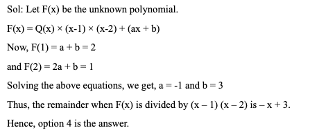 Q54. A polynomial yields a remainder of 2 when divided by (x – 1) and a remainder of 1 when divided by (x – 2). If this polynomial is divided by (x – 1) (x – 2), then the remainder is: