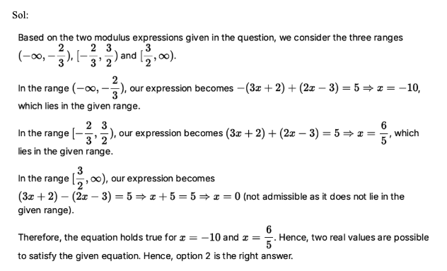 Q56. How many distinct real values of x satisfy the equation |3x + 2| – |2x – 3| = 5?