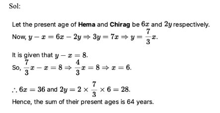 Q57. Hema said to Chirag, “When I was half as old as you are today, you were one-sixth as old as I am now”. If Hema is eight years older than Chirag, then what is the sum of their present ages?