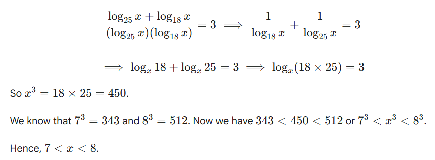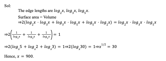 Q11. The numerical values of the surface area and the volume of a cuboid are equal. If the edge lengths are log2 x, log3 x, log5 x, then the value of ‘x’ is: