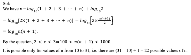 Q12. If x = log10 (1 + 2 + 3 + … + n) + log10 2, where n is a natural number. Find the number of possible values of n for which 2 < x < 3.