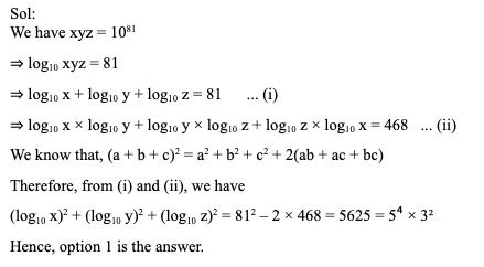 Q7. Let xyz = 1081 and log10 x × log10 y + log10 y × log10 z + log10 z × log10 x = 468, where x, y and z are positive numbers, then (log10 x)2 + (log10 y)2 + (log10 z)2 is divisible by: