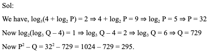 Q8. If log3(4 + log2P) = 2 and log2(log3Q – 4) = 1 then the value of P2 – Q is: