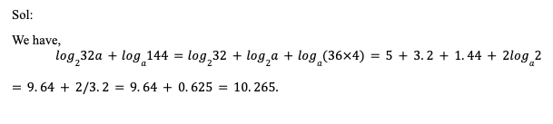 Q36. If loga 36 = 1.44, and log2 a = 3.2, then find the value of log2 32a + loga 144.