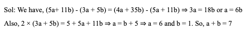 Q1. If 5, 3a + 5b, 5a + 11b and 4a + 35b are in AP, what is the value of a + b?