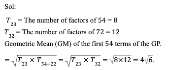 Q11. The 23rd term and the 32nd term of a geometric progression are the number of factors of 54 and 72, respectively. What is the geometric mean of the first 54 terms of the progression?