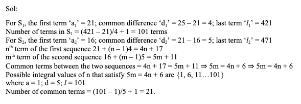 Q15. Find the number of common terms between the two sequences S1 = {21, 25, 29, …, 421} and S2 = {16, 21, 26, …,471}.