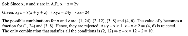 Q3. Three positive integers x, y and z are in arithmetic progression. If y – x > 1 and xyz = 8(x + y + z), then z – x equals:
