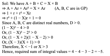 Q6. If A, B, C are three distinct real numbers in Geometric Progression (GP) and A + B + C = X × B, then what is the sum of all integral values of X in the interval (–5, 5)?