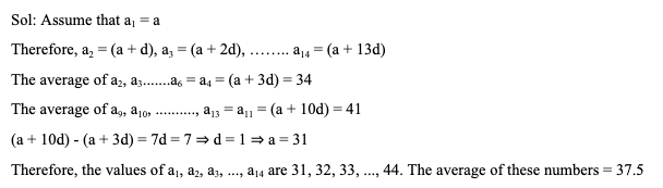 Q7. a1, a2, a3, …, a14 are natural numbers in arithmetic progression. The average of a2, a3, ……, a6 is 34 and that of a9, a10, …….., a13 is 41. Find the average of all the 14 numbers.