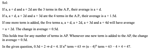 Q9. An arithmetic progression has n terms and the average of the n terms is 23. If (n + 1)th term is added to the progression, the average becomes 25. If the nth term of the progression is 63, then the (n – 4)th term will be: