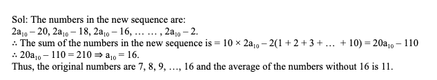 18. Let a1, a2, a3, …, a10 be a sequence of ten consecutive natural numbers. Consider a new sequence of ten consecutive even numbers having 2a10 – 2 as the last term of the sequence. If the sum of the numbers in the new sequence is 210, then the average of the numbers of the original sequence without a10 is: