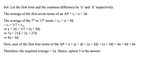 Q26. The average of the first seven terms of an AP is 3/7 times the average of the 7th to 13th terms of the same AP. The average of the first four terms will be: