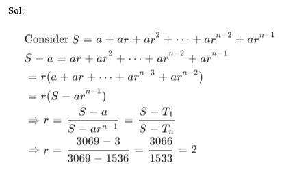 Q29. In a geometric progression, the sum of the first n terms is 3069 and the first term is 3. If the nth term in the progression is 1536, find the common ratio.