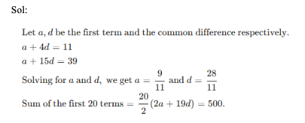 Q30. Find the sum of the first 20 terms of an arithmetic progression, if its 5th term is 11 and its 16th term is 39.