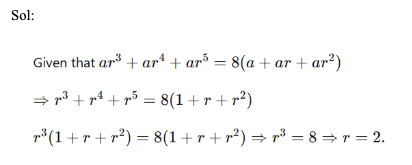 Q32. In a geometric progression, the sum of the fourth, fifth and sixth terms is eight times the sum of the first three terms. Find the common ratio.