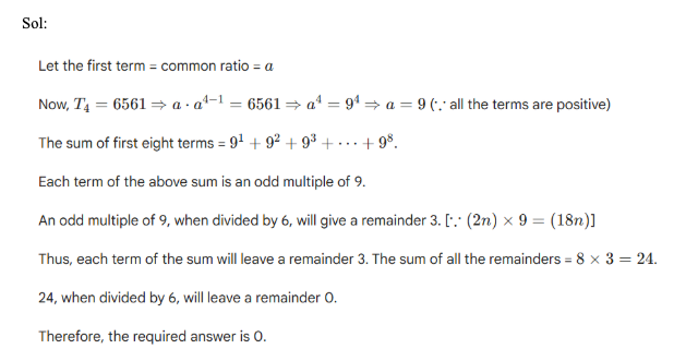 Q33. The fourth term of a geometric progression with a common ratio same as the first term is 6561. If all the terms of the progression are positive, find the remainder when the sum of the first eight terms is divided by 6.