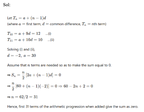 Q34. In an arithmetic progression, the 10th term is 12 and the 11th term is 10. How many consecutive terms (starting from the first term) of the arithmetic progression should be considered so as to make their sum equal to zero?