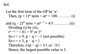 Q35. Let the (q – 2)th and (p + 1)th terms of a geometric progression be 4/3 and 108 respectively, where p > q. If the common ratio of the GP is an integer r, then what is the largest possible value of r/(p – q)?
