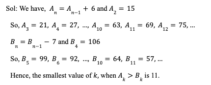 Q36. Sequence A is defined as An = An – 1 + 6, A2 = 15 and sequence B is defined as Bn = Bn – 1 – 7, B4 = 106. If Ak > Bk, then find the smallest value that k can take.