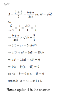 Q37. The arithmetic mean of 1/a and 1/b is A and the geometric mean of a and b is G. If G: 1/A = 5: 4, then the ratio of b: a can be: