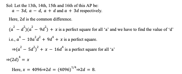 Q38. If 4096 is added to the product of the 13th, 14th, 15th and 16th term of an arithmetic progression, then a perfect square is obtained. If each term of this arithmetic progression is a positive integer, then find the common difference of the arithmetic progression.
