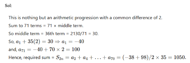 Q40. The sequence a1, a2, a3, ……… a71 satisfied the condition an+1 = an + 2 for n = 1, 2, 3, …, 70. If the sum of all the terms a1 through a71 is 2130, find the sum of all terms of the form a2n in this series, where n is a natural number.
