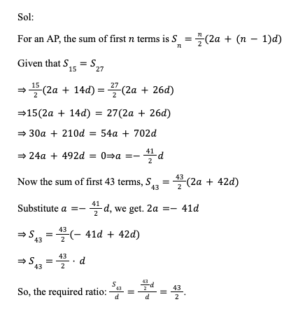 Q41. Find the ratio of the sum of the first 43 terms of an AP to the common difference if the sum of the first 15 terms and that of the first 27 terms of this AP is equal.