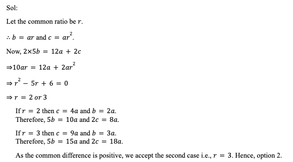 Q42. Three natural numbers a, b and c are in geometric progression such that the common ratio is also a natural number. If 12a, 5b, and 2c are in arithmetic progression in that order with a positive common difference, then the common ratio of the geometric progression made of a, b and c in that order equals: