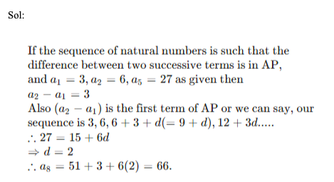 Q46. A sequence of natural numbers is such that the difference of two successive terms is in an Arithmetic Progression. If the first, second and fifth terms are 3, 6 and 27 respectively. Find the eighth term of the sequence.