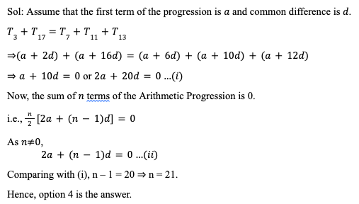 Q49. The sum of the 3rd and 17th elements of an Arithmetic Progression is equal to the sum of the 7th, 11th and 13th elements of the same progression. If the sum of n terms of such a progression is zero then what is the value of n?