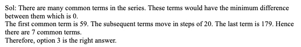 Q51. There are two series S1 and S2 given as 3, 7, 11, 15, …….. 50 terms and 194, 189, 184, …… 30 terms respectively. If D is the least absolute difference between any two terms one from S1 and other from S2, how many pairs of terms, one from each sequence, have their absolute difference as D?