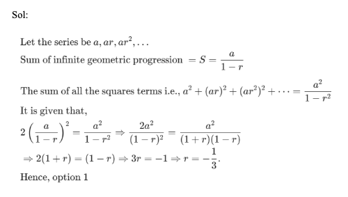 Q56. If in an infinite Geometric Progression, the sum of the squares of all the terms equals twice the square of sum of all the terms, then find the common ratio of the progression.