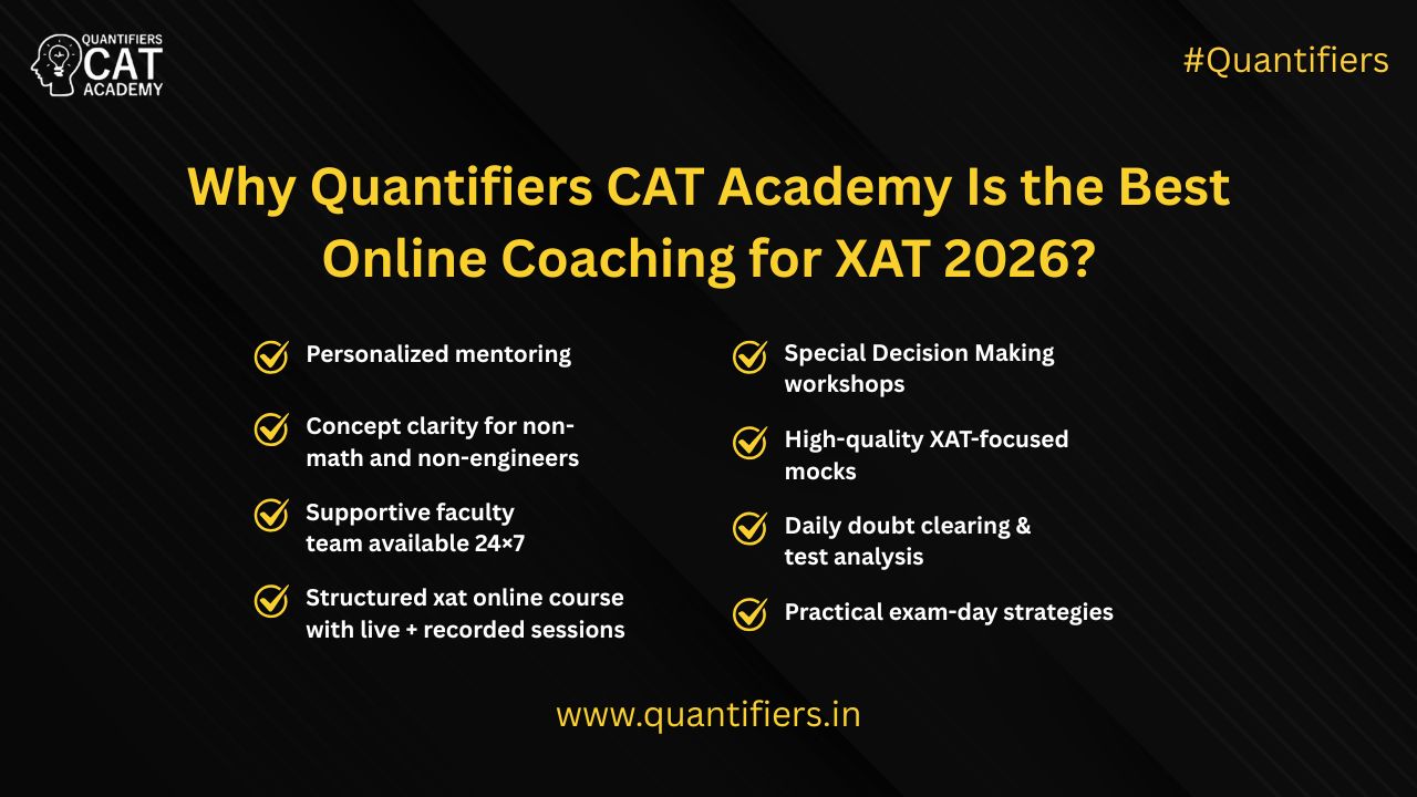 XAT 2026 demands discipline, reasoning ability, conceptual clarity, and a strong strategy—qualities that Quantifiers helps every student build. Whether you’re preparing for xat 2026, targeting xlri admission 2026, or looking for the perfect xat preparation online, Quantifiers CAT Academy stands beside you at every step.